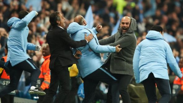 The City coaching staff goes wild after Sterling puts the ball into the goal.