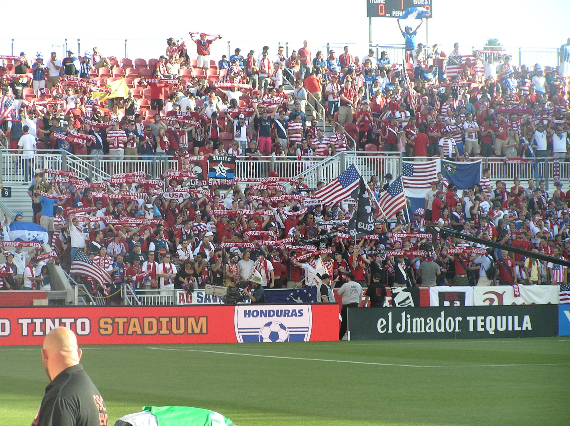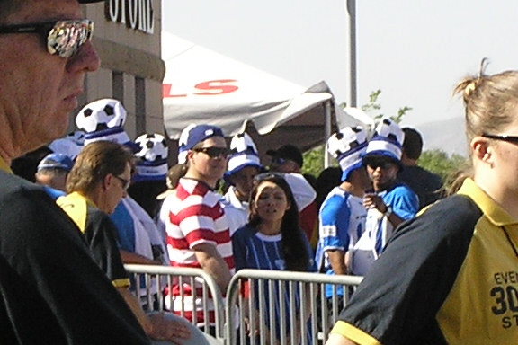 All-State insurance has an agreement with the USSF to market at USA matches. They had a tent outside Rio Tinto with USSF logos all over it. Just give them your name and email and they give you a FREE soccer hat! Complete with a soccer ball image on top! BUT , the same guy who was in charge of Rio Tinto parking must have been in charge of selecting the hat colors. One would expect red, white and blue, yes? Well, All-State chose to use ” the All-State colors” of blue and white, at least that is the reason we were given for the choice of colors. Now, if the USA was playing anybody else in the hex it would be no big deal. BUT Honduras’ colors happen to also be blue and white. Sooooo, the Honduran fans , by the droves, gave All- State their info and gratefully walked away with more garb with which to support their team.