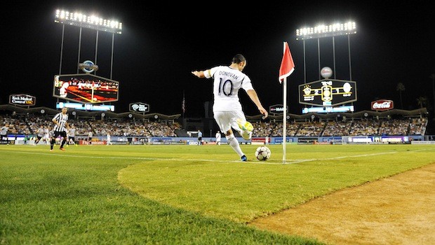 Landon Donovan takes a corner in Dodger Stadium for LA Galaxy vs Juventus